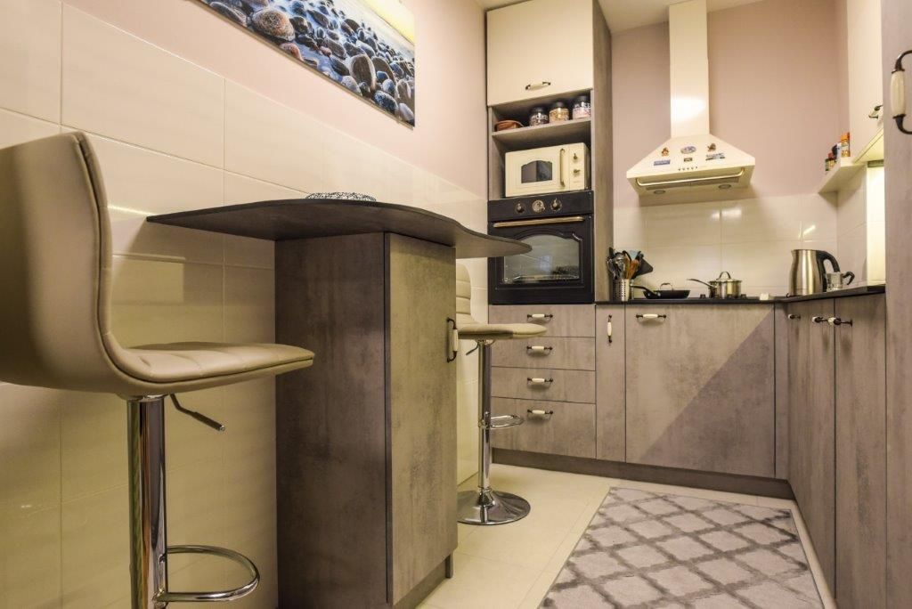 Moderno uređen stan sa retro detaljima poput starog gramofona te velikog ogledala sa klasičnim okvirom daju poseban šarm ovom stanu. Koristili smo sive tonove u kuhinji i dnevnom boravku, sa plavim detaljima.