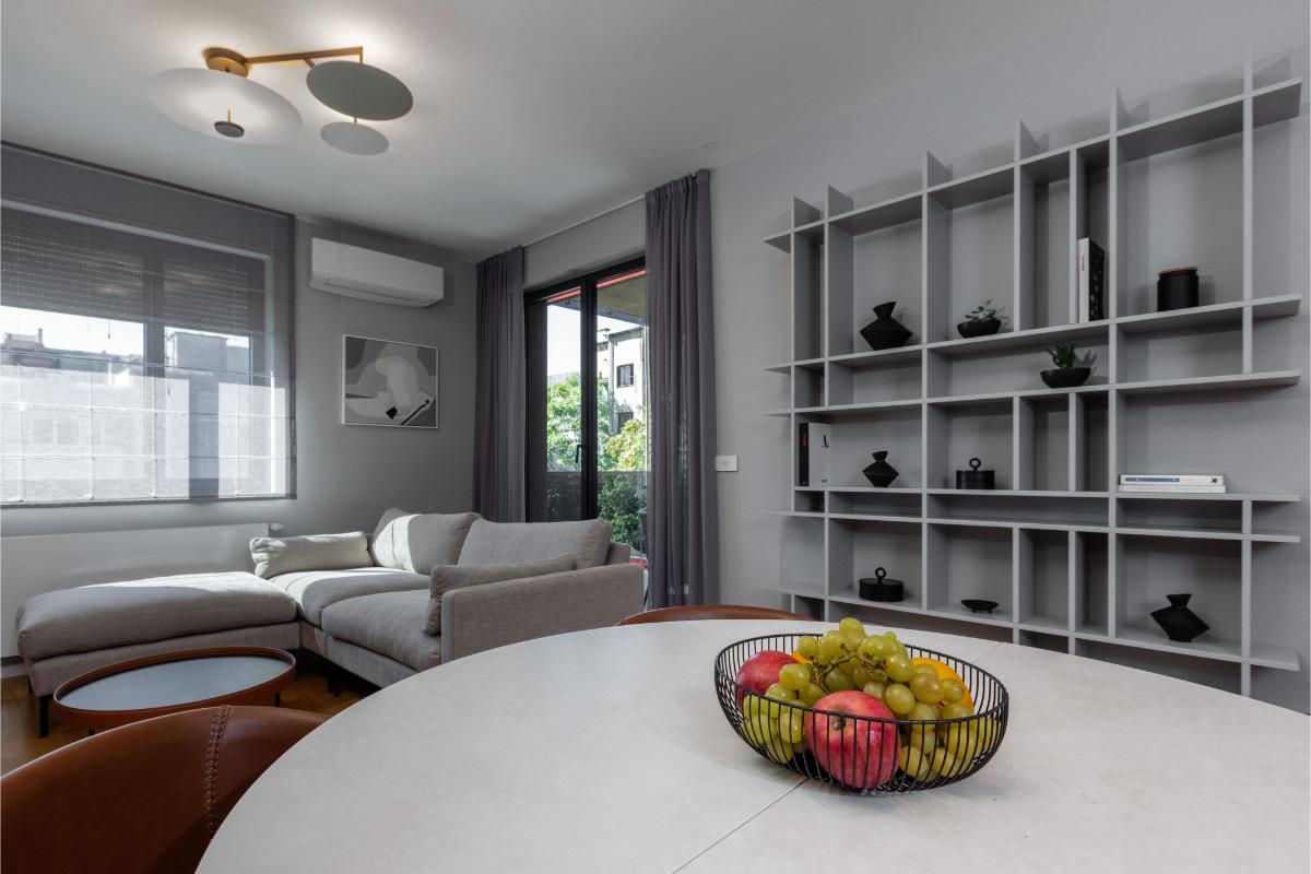 U dnevnoj sobi, koja je srce ovog stana, odlučili smo se za dvije vrste zavjesa – paket zavjese na prozorima te klasične zavjese na staklenoj stijeni koja vodi na terasu. Kombinacija ovih stilova donijela je dodatnu dinamičnost u prostor, ističući različite zone dnevne sobe i naglašavajući funkcionalnost svakog elementa.